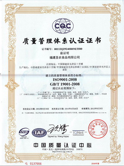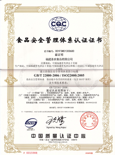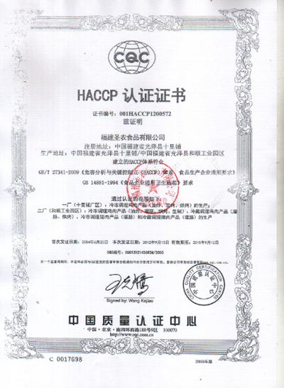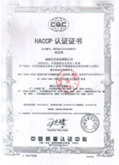 工廠以ISO9001國際質量管理體系為主框架, 嚴格執行GMP與SSOP,全面實施HACCP食品質量與安全管理體系。